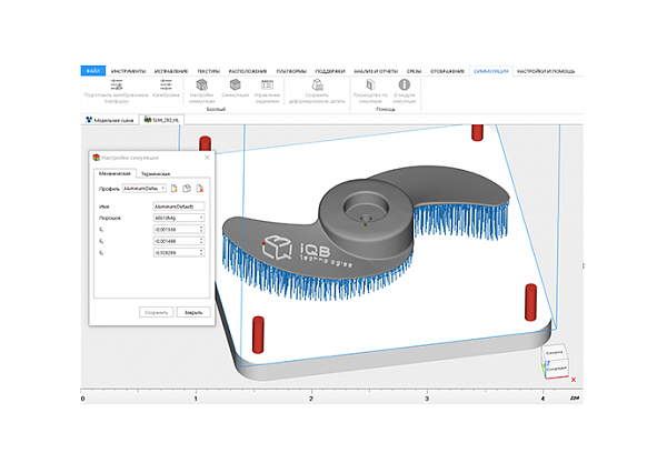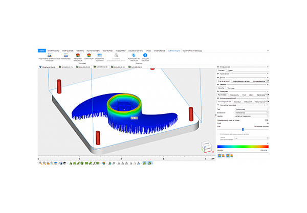 • Термическая симуляция (отображение рисков перегрева, отображение температурной карты на каждом слое, температуры после завершения построения, получение детали с компенсирующими искажения геометрии размерами)